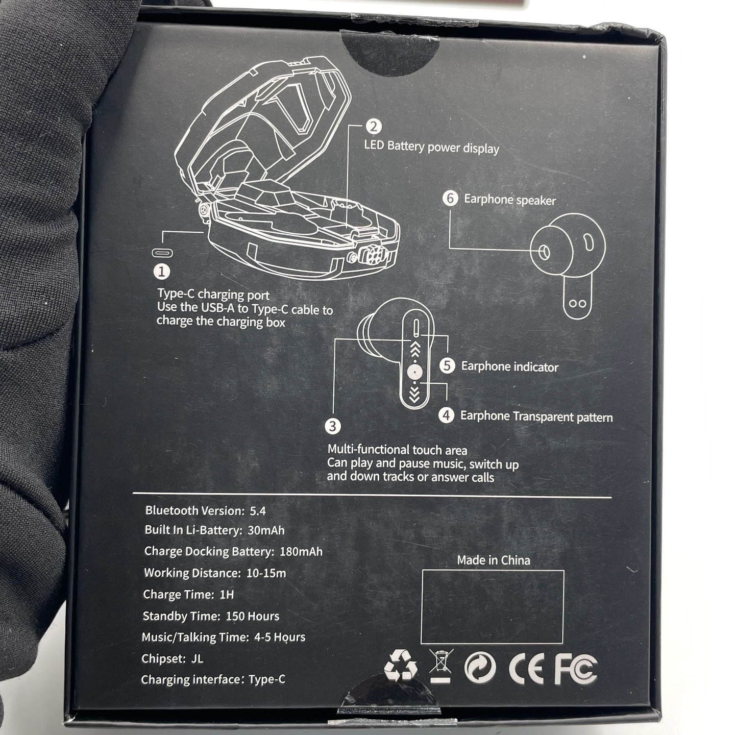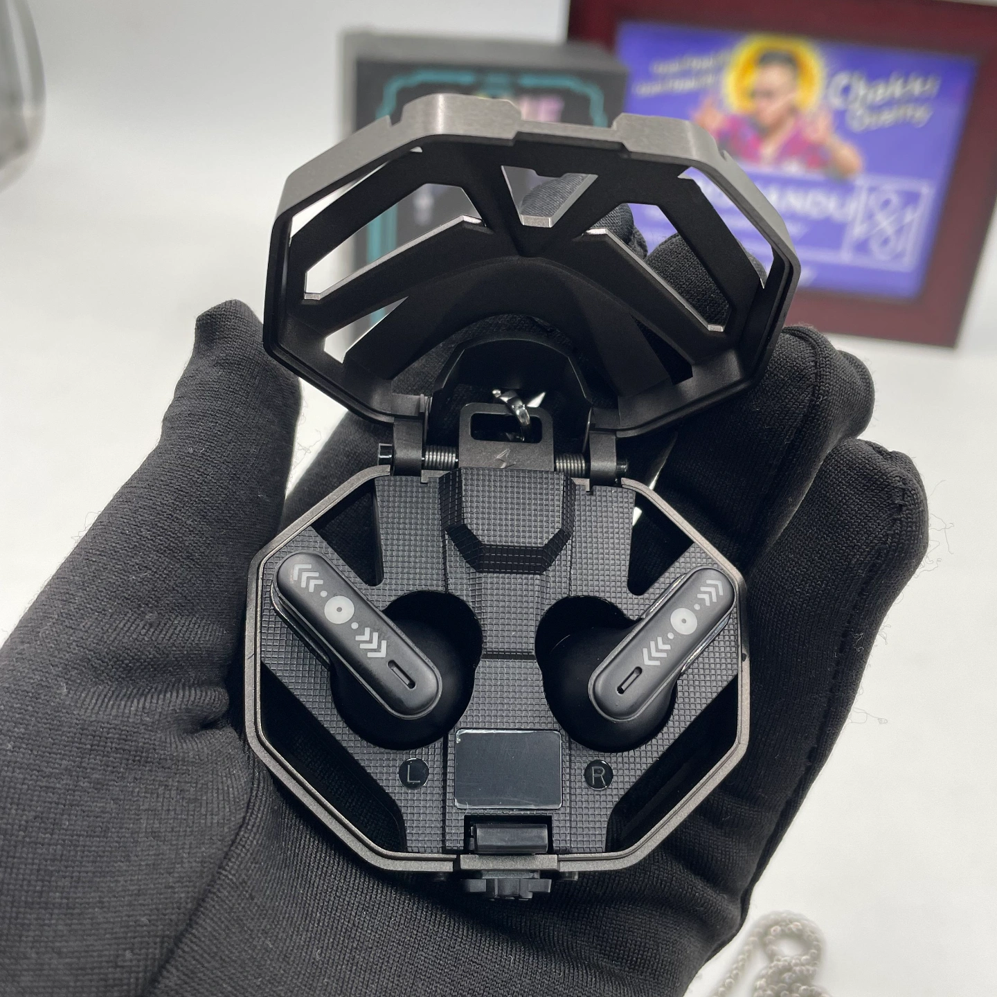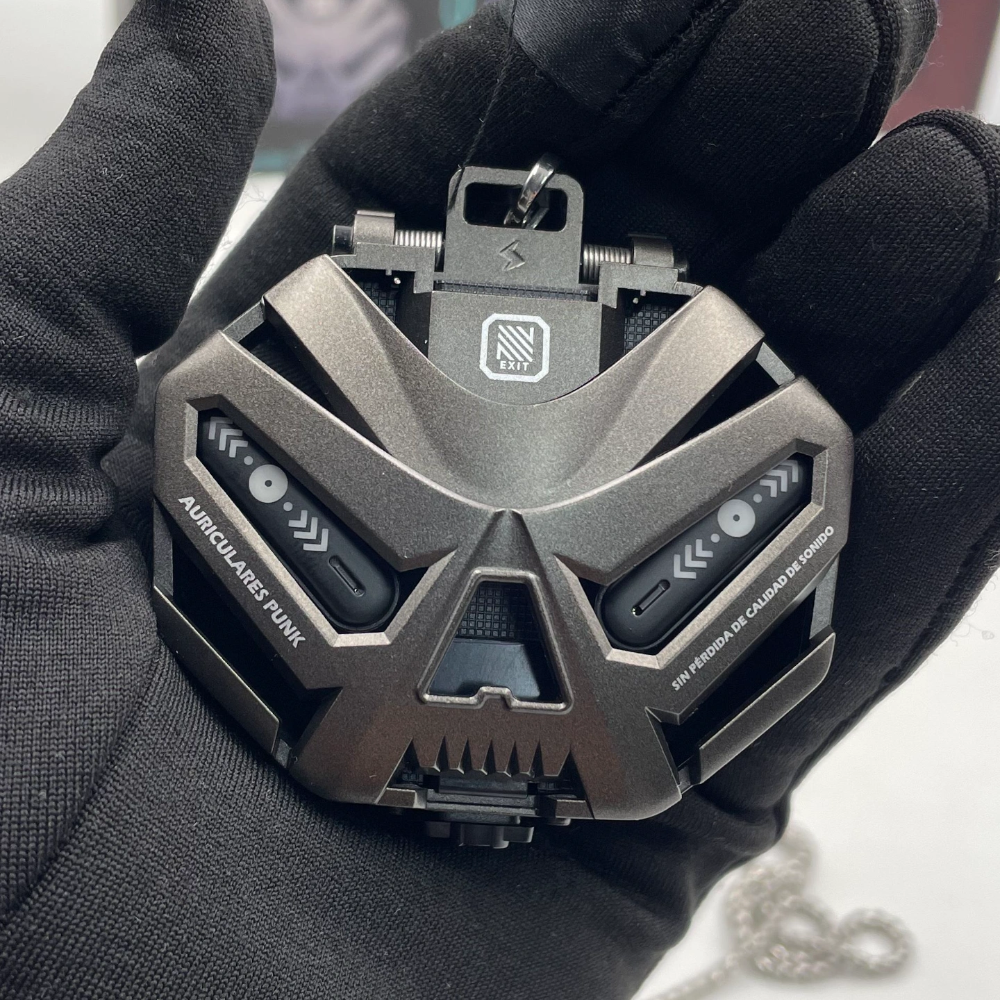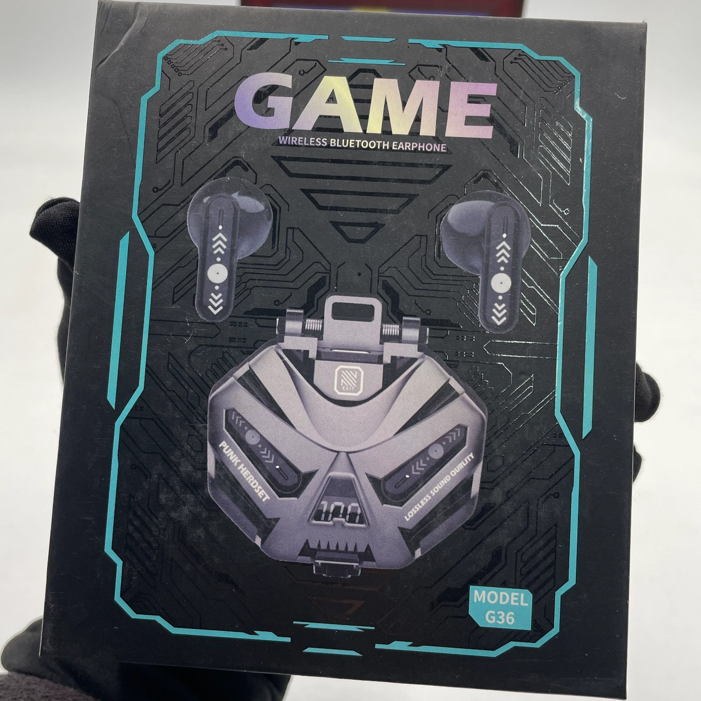 Premium gaming-style wireless earbuds with a bold, futuristic mech-inspired charging case.