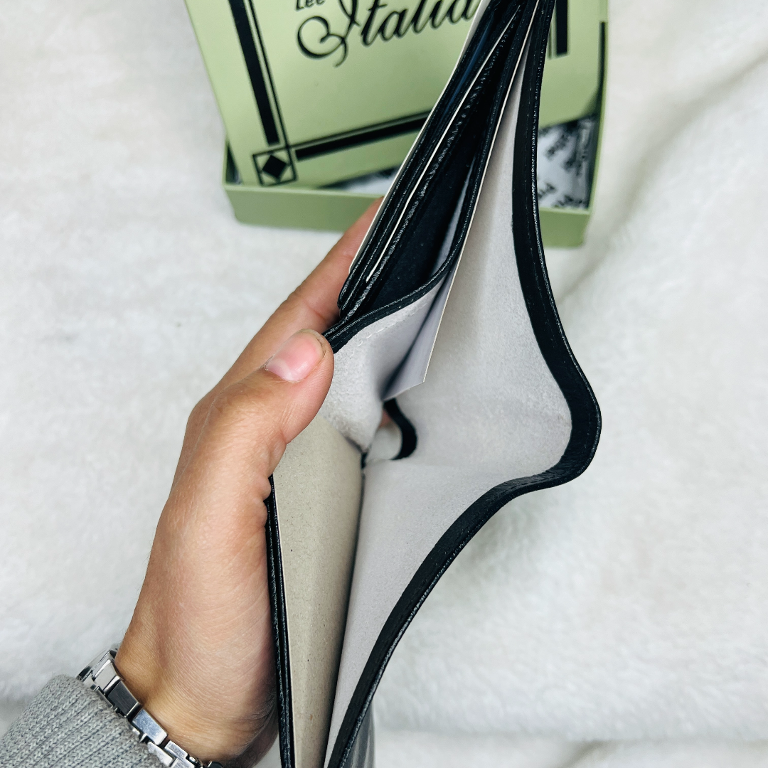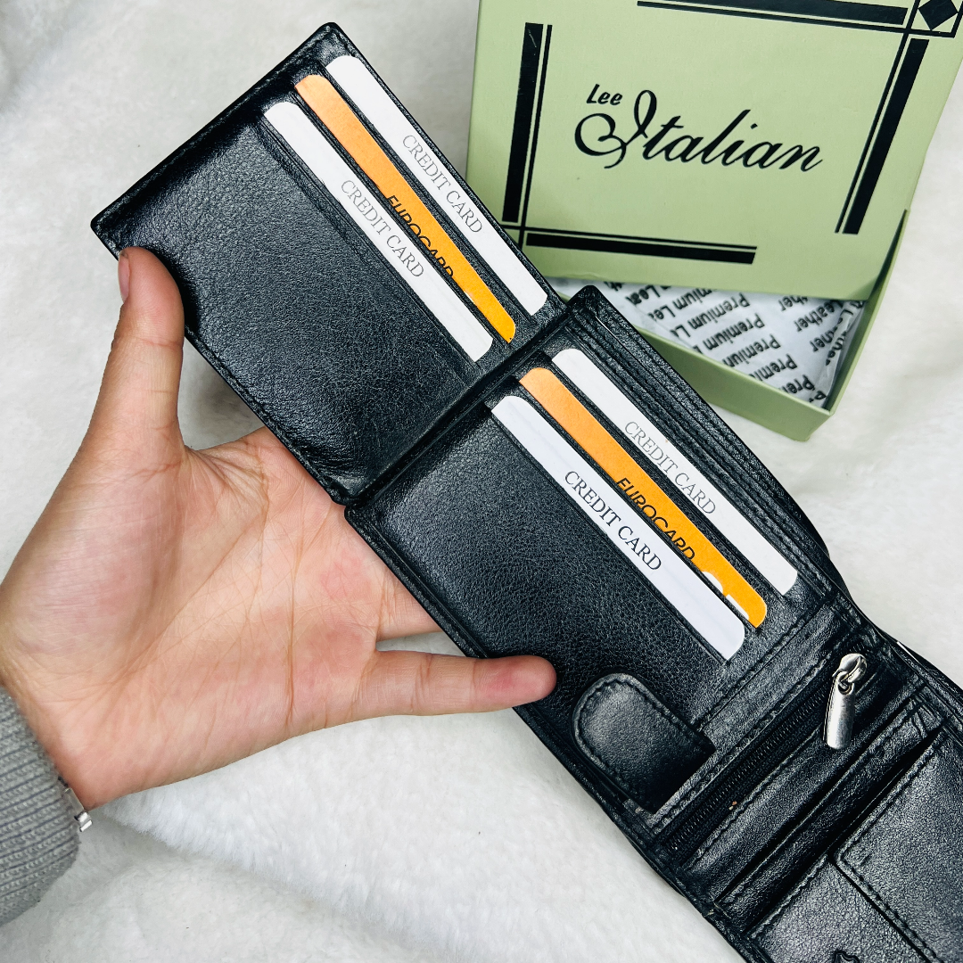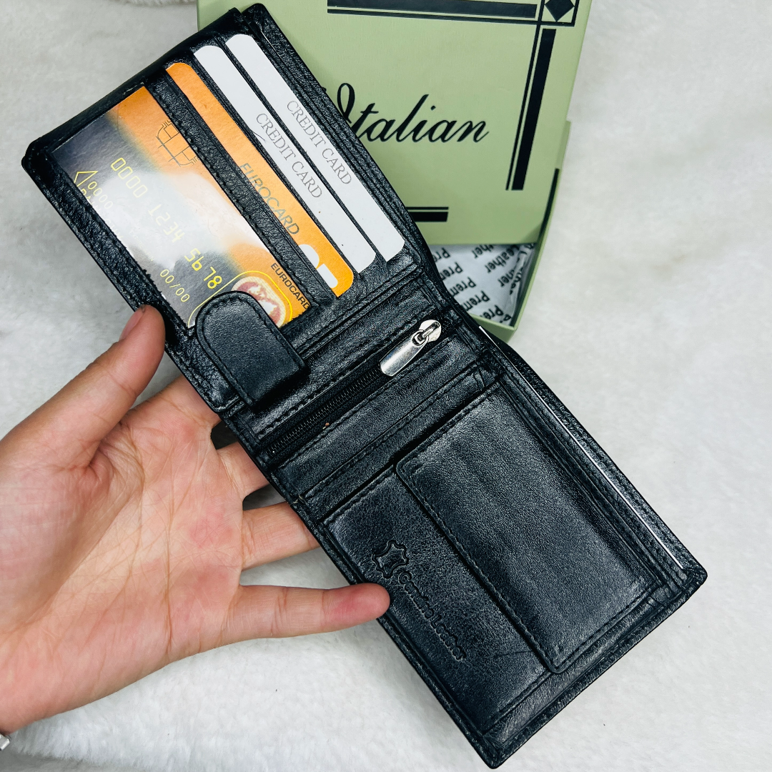 Multiple compartments for cards, cash, and coins.