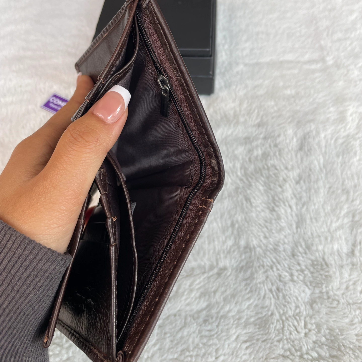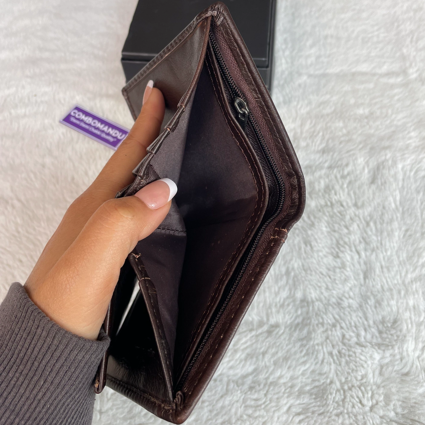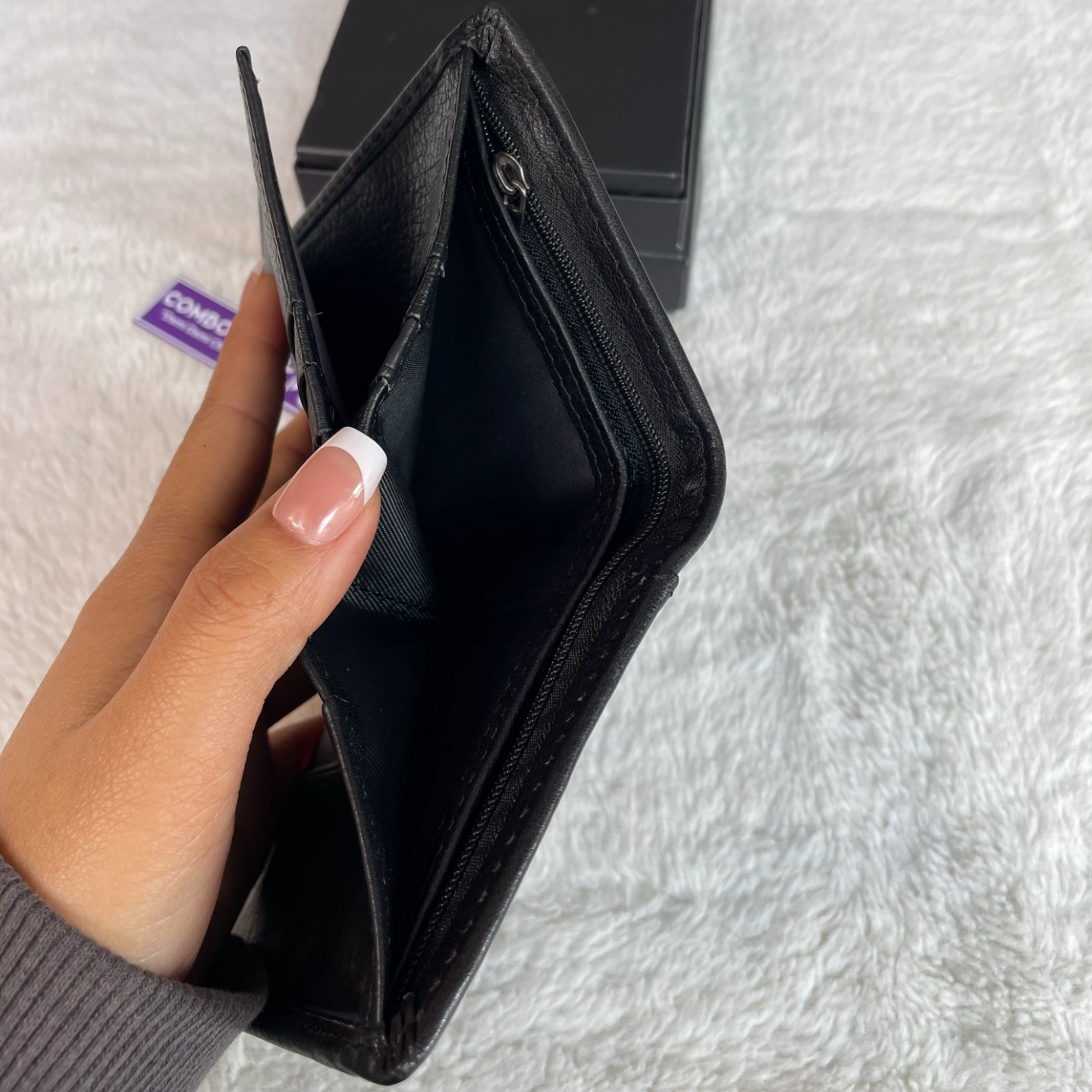 Multiple compartments for cards, cash, and coins.